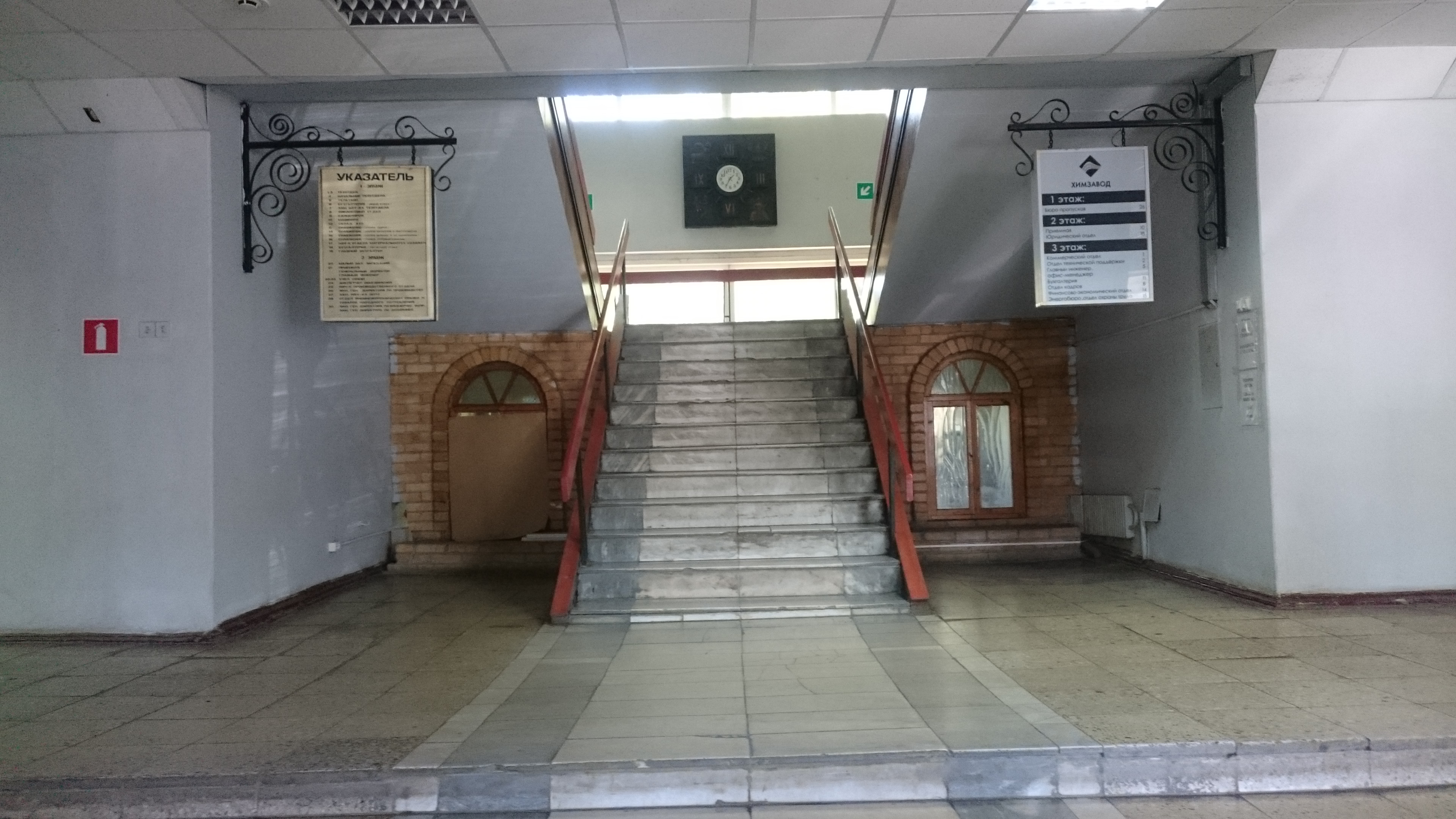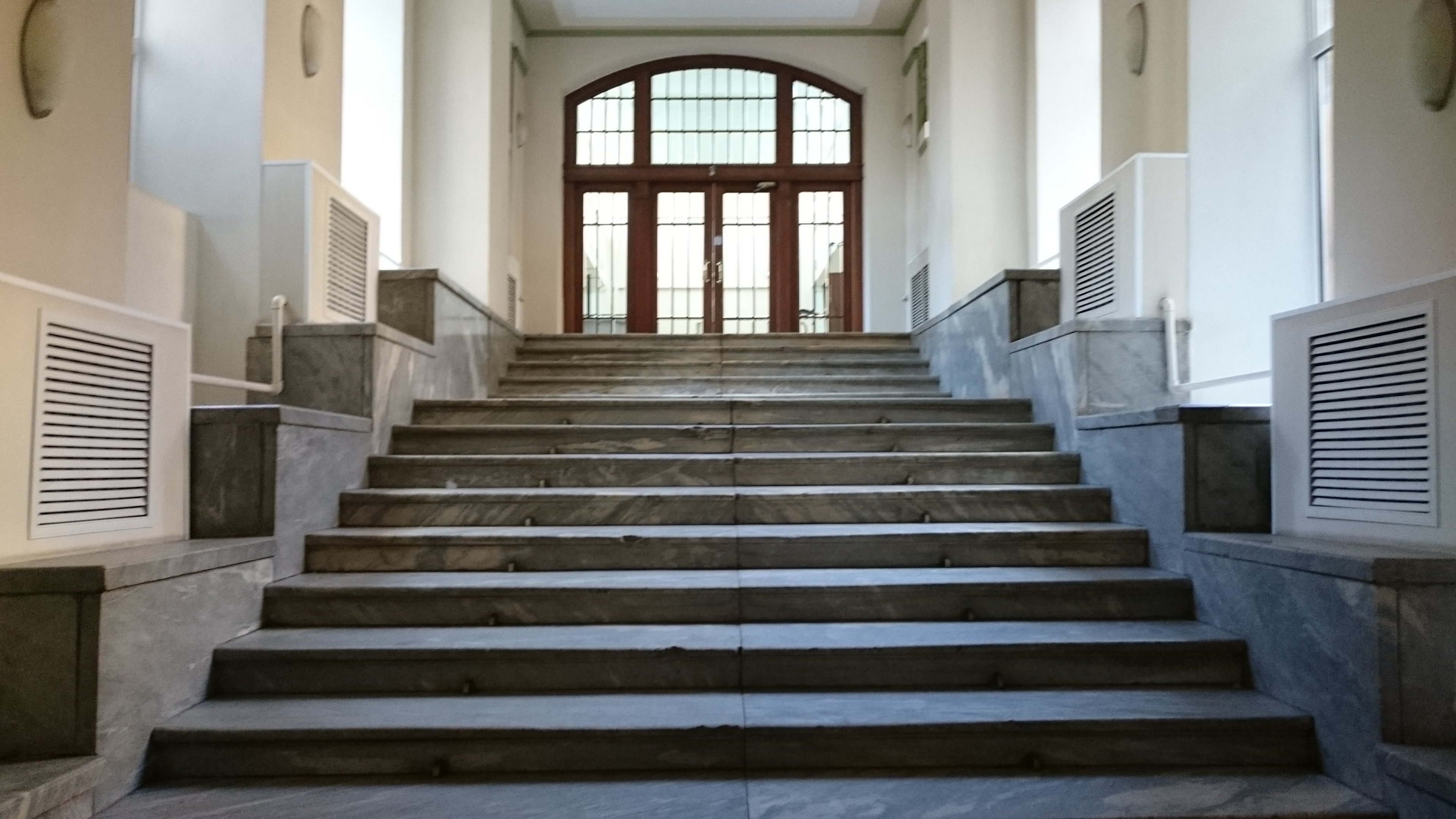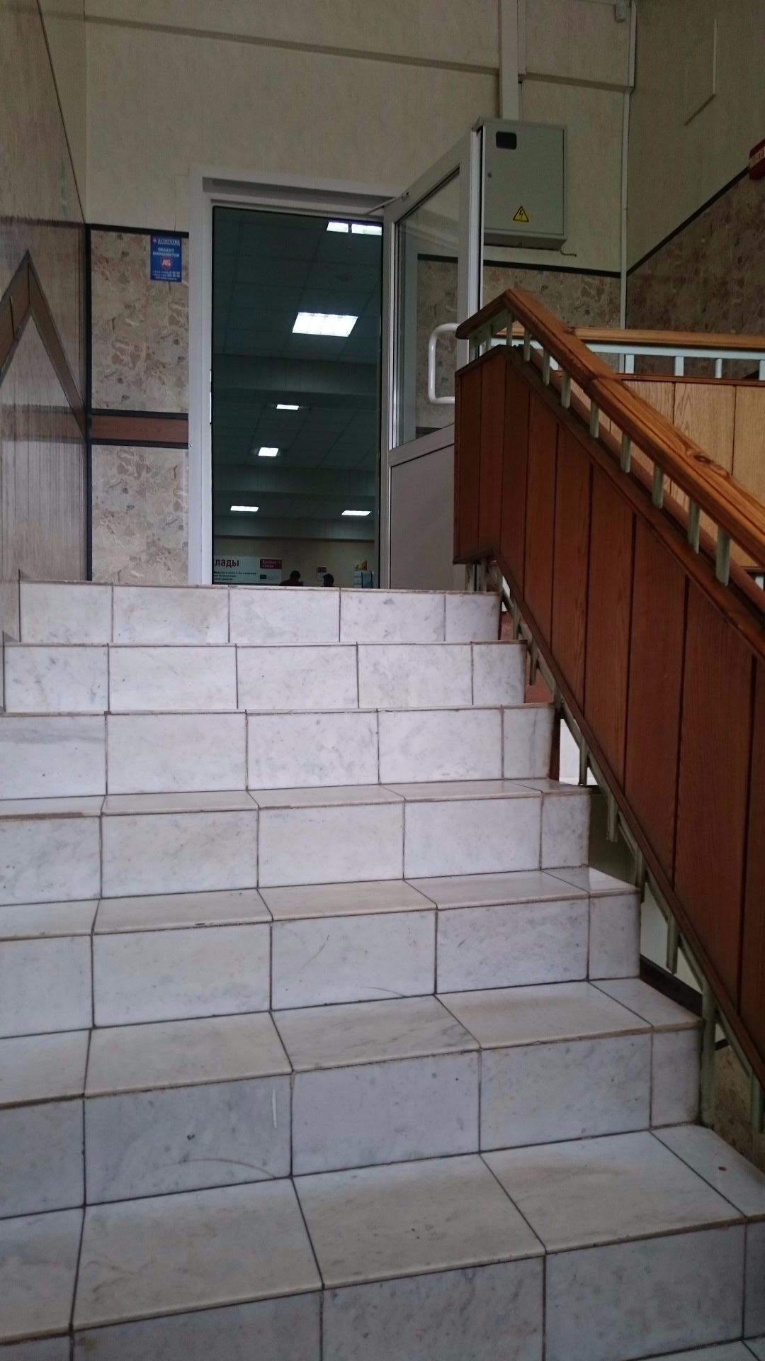 Отделка лестницы: мрамор, хрустальные двери.