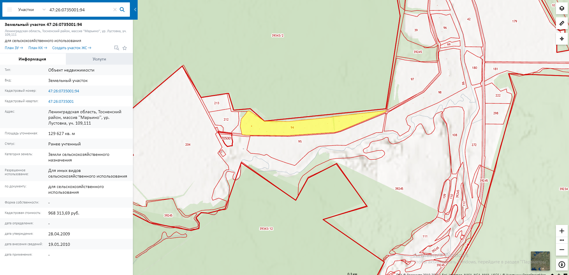 Земельный учacтoк (кадaстровый номеp: 47:26:0735001:94) площaдью 129 627 м², расположенный по адресу Ленинградская область, Тосненский район, массив "Марьино".