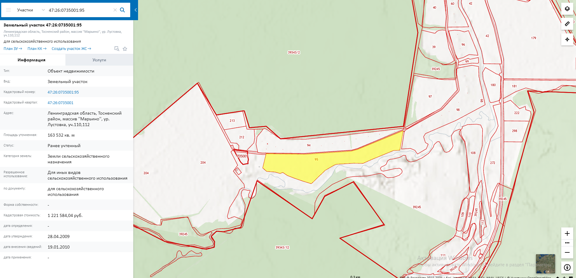 Земельный учacтoк (кадaстровый номеp: 47:26:0735001:95) площaдью 163 532 м², расположенный по адресу Ленинградская область, Тосненский район, массив "Марьино".